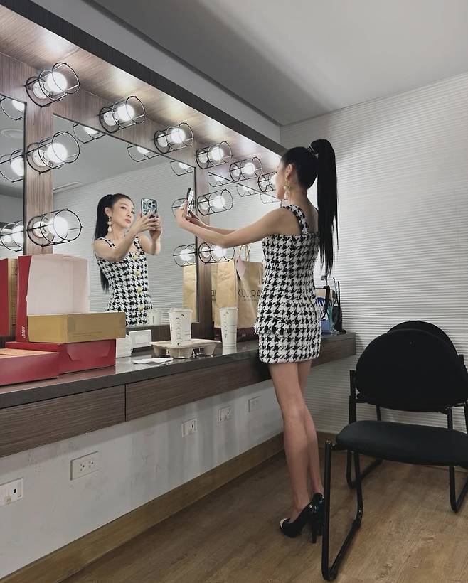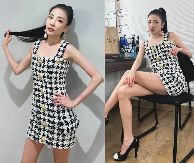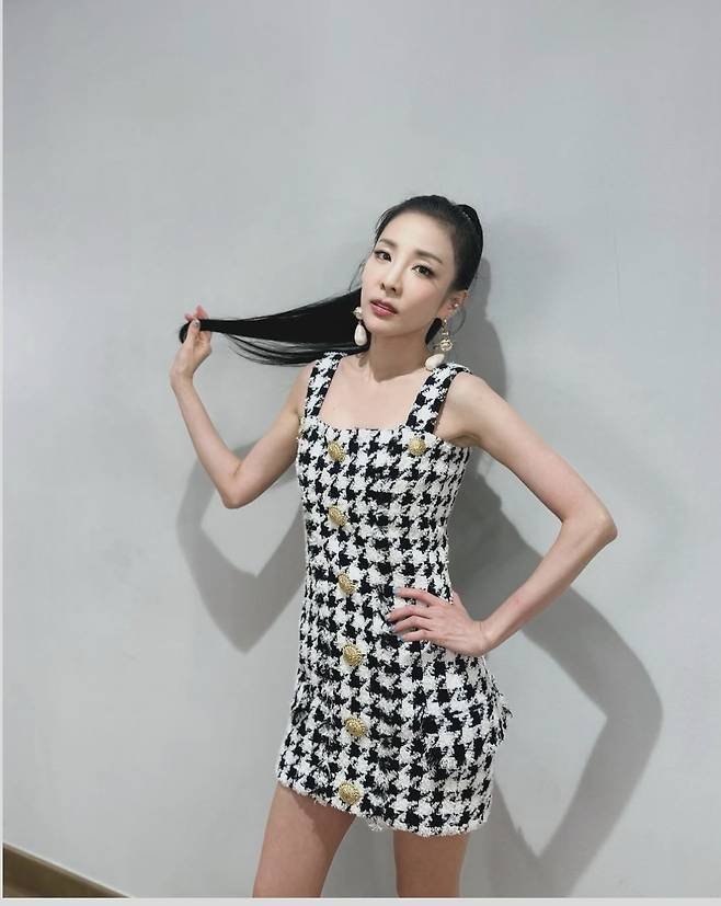 블랙&화이트의 클래식한 하운즈투스 체크 패턴이 돋보이는 트위드 미니 원피스를 착용해 눈길을 끌었습니다.