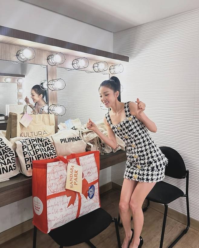산다라박은 하이힐을 매치해 다리라인을 더욱 강조했고, 포니테일 헤어스타일과 볼드한 드롭 이어링으로 세련된 분위기를 연출해 러블리하면서도 시크한 매력을 극대화했습니다.