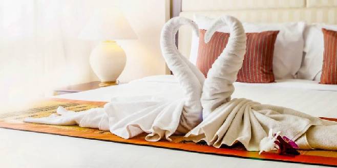 벽지와의 색상 매치, 쿠션과의 어울림까지 세세하게 신경 쓴 흔적을 느낄 수 있죠. 게다가 수건이나 장식품이 베드 러너 위에 데코레이션 되어 있는 모습은 또 다른 재미를 선사합니다. 학 모양의 수건, 귀여운 동물 형태의 수건 장식들은 고객들에게 미소를 자아내게 하죠.