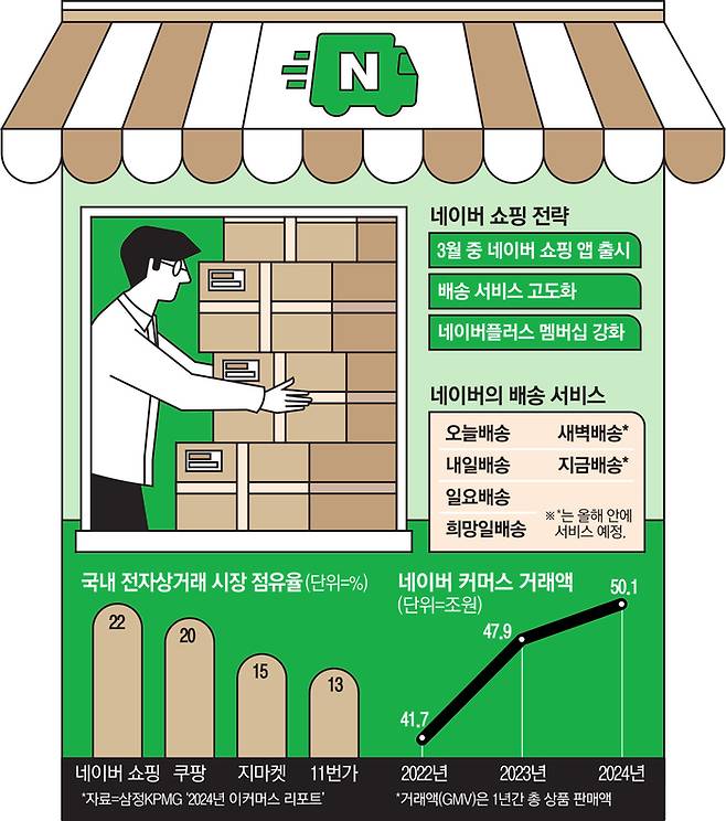 네이버의 ‘이커머스 굴기’는 자사 정체성을 포털이 아니라 ‘쇼핑 플랫폼’으로 공식 선언했다는 점에서 의미가 깊다. 국내 이커머스업계 선두 주자인 쿠팡과의 정면 대결도 피할 수 없다. 삼정KPMG의 ‘2024년 이커머스 리포트’에 따르면 네이버(22%)와 쿠팡(20%)은 국내 이커머스 시장을 양분하고 있다.