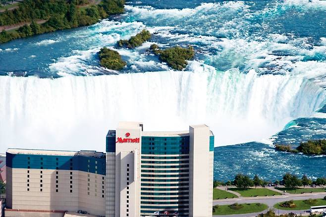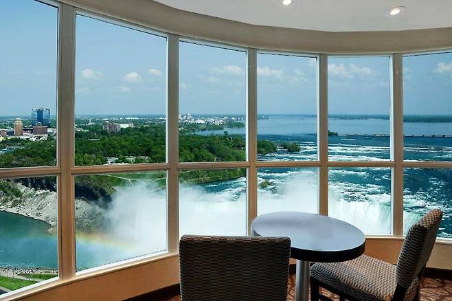 캐나다 온타리오주에 위치한 '나이아가라 폴스 메리어트 폴스뷰 호텔&스파' (Niagara Falls Marriott Fallsview Hotel&Spa)는 통유리창으로 폭포의 풍경을 감상할 수 있습니다.