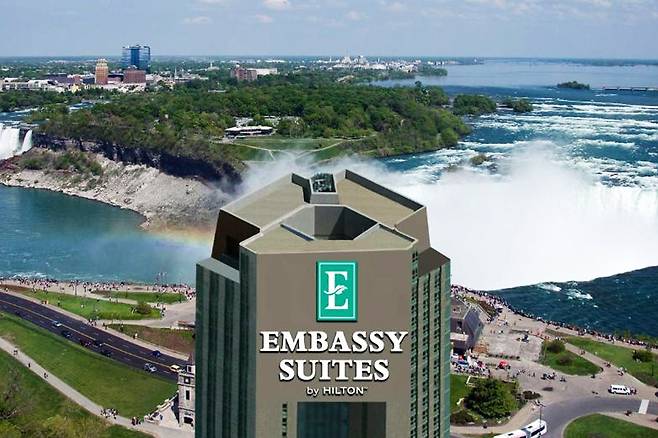 '나이아가라 앰버시 스위트 힐튼'(Embassy Suites by Hilton Niagara Falls Fallsview)은 나이아가라 폭포를 감상할 수 있는 대표적인 호텔로 손꼽힙니다.