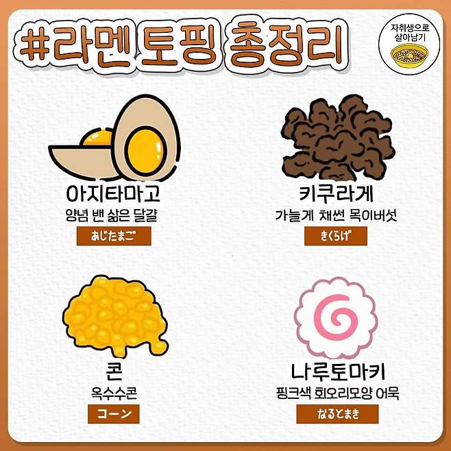 ๋ฅ: ์ผ์ (๊ฐ์ฅ), ๋์ฝ์ธ (๋ผ์ง๋ผ), ๋ฏธ์(๋์ฅ), ์์ค(์๊ธ), ์ธ ์ผ๋ฉ(์ฐ์ด๋จน๋ ๋ผ๋ฉ)