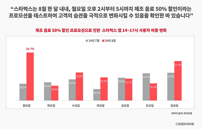 이 문제를 해결하기 위한 아이디어를 얻기 위해, 스타벅스는 버디 패스를 출시하기 두 달 전인 8월, 월요일 오후 2시부터 5시까지 사이렌 오더로 제조 음료를 주문하면 50% 할인해 주는 파격적인 프로모션 역시 테스트했었습니다. 그 결과, 해당 시간대에 스타벅스 앱 사용자 비중이 다른 요일보다 약 10%p 증가하는 긍정적인 결과를 얻기도 하였는데요.