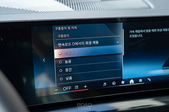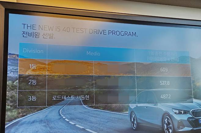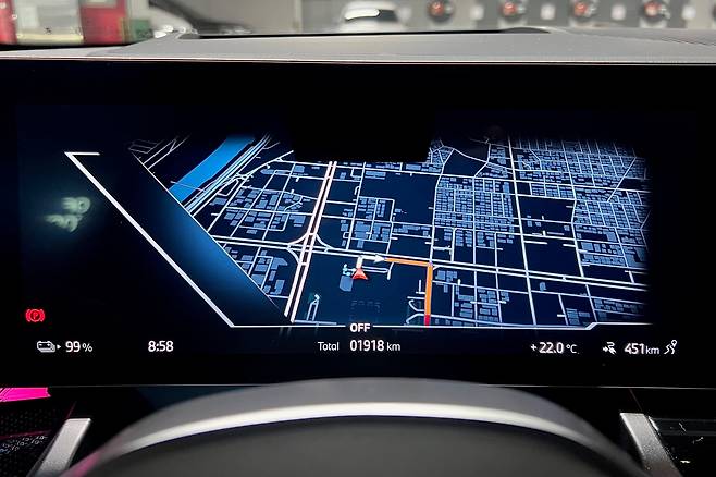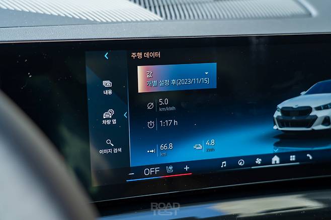 고속도로에서도 전비는 쭉쭉 올랐다. 어댑티브 크루즈 컨트롤을 시속 100㎞로 설정하고 유유자적 달리다 보니, 어느새 평균 전비는 6㎞/㎾h를 돌파했다. 이는 낮은 공기저항계수의 영향도 있다. 각진 외모와 달리 i5 eDrive40의 공기저항계수는 ‘Cd 0.23’에 불과하다. 고성능 버전 i5 M60 xDrive(Cd 0.25) 및 내연기관 모델인 520i·520d(Cd 0.24)과 비교해도 가장 낮다.