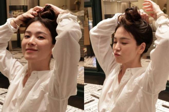 흰 셔츠를 입고 긴 머리를 틀어올린 채 포즈를 취하고 있는 송혜교는 카메라를 향해 환하게 웃거나 입술을 쭉 내밀면서 귀여운 표정을 지어 보였습니다.