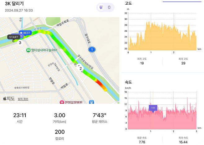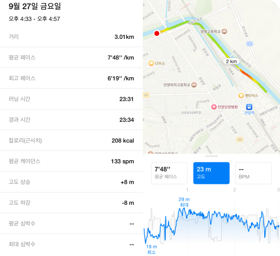 러닝 데이터도 꽤 쓸만하다. 나이키 런클럽과 비슷하게 걸린 시간, 뛴 거리, 평균 속도, 소모 칼로리, GPS 경로, 고도 등을 알려준다. 일간, 주간, 월간, 연간, 전체 누적 기준 기록을 지원하는 나이키 런클럽과 다르게 런데이는 연간 기록을 제공하지 않는 차이가 있다.