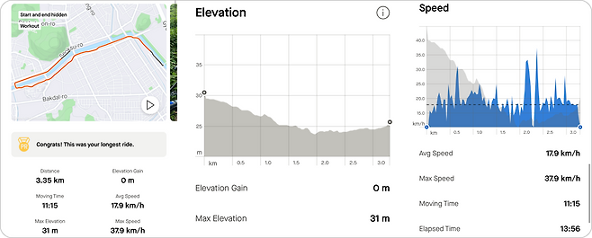 아이폰 이용자의 경우 사이클 운동을 측정하려면 애플 워치가 별도로 있어야 하는데 미 피트니스 앱을 사용하면 별도의 웨어러블 디바이스가 없어도 된다. 주간, 월간, 연간, 전체 누적 단위로 GPS 경로, 이동 거리, 속도 등의 기초적인 사이클 데이터를 얻을 수 있다. 스트라바 무료 사용을 기준으로 미 피트니스는 고도를 제외한 대부분의 사이클 데이터 항목을 지원한다.