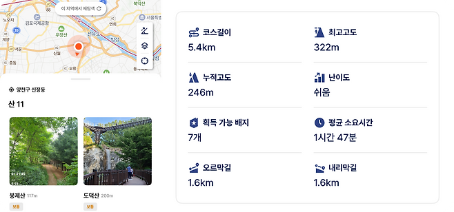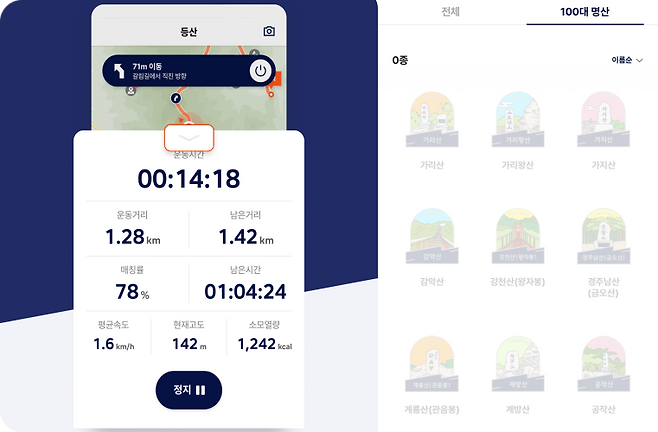 하이킹을 시작하면 GPS 지도로 상세 경로를 안내하고 운동 시간, 이동 거리, 남은 거리, 경로와의 매칭률, 남은 시간, 속도, 고도, 칼로리를 알려준다. 사용자의 동기부여를 자극하는 배지 시스템도 갖추고 있는데 국내 100대 명산 배지를 비롯해 코스별로 다양한 배지 획득이 가능하다.