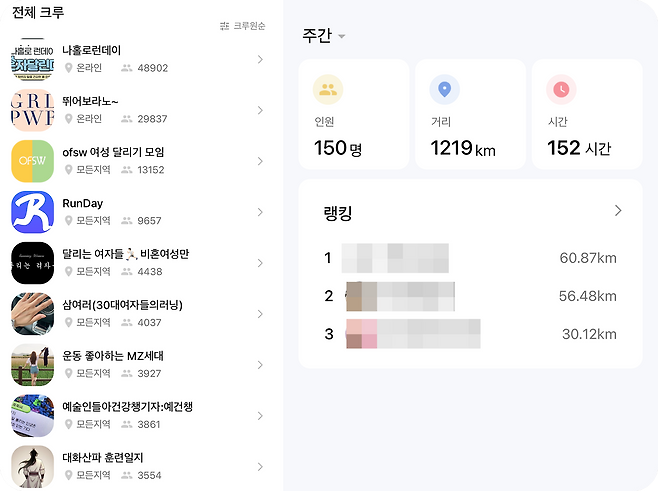 다양한 러닝 크루에 가입해 활동이 가능하다. 지역, 성별, 관심사에 따라 다양한 크루가 개설되어 있고 자신이 직접 만드는 것도 가능하다. 크루에 들어가게 되면 직접적인 소통 기능은 없지만 크루원끼리 주간 러닝 누적 기록을 경쟁할 수 있어 사용자의 동기부여에 도움을 준다.
