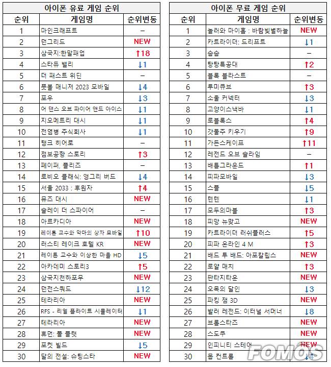 아이폰 유료 게임 순위에서는 국내 개발사가 제작한 인기 인디 게임 '던그리드'가 모바일 버전 출시와 함께 2위에 올랐다.
