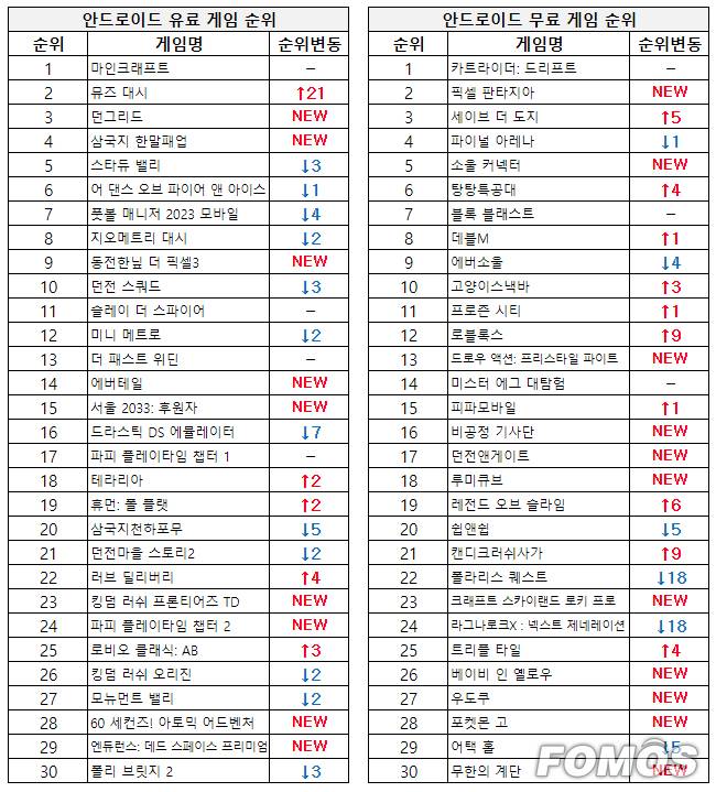 한편, 유료 게임 순위에서는 리듬 게임 '뮤즈 대시'가 1400원으로 저렴한 가격에 세일을 진행하며 2위로 올랐다.