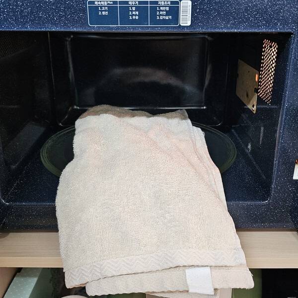 수건을 깨끗하게 빨아 물기를 꽉 짜낸 뒤, 살짝 축축한 상태로 전자레인지에 1분만 돌려보세요.