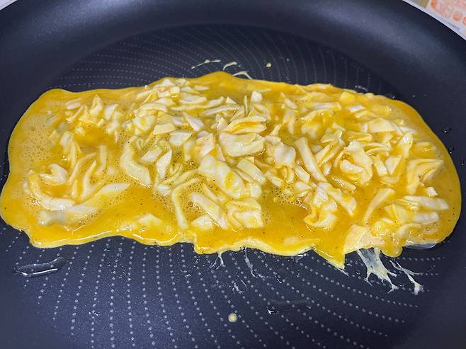 양배추 계란물은 식빵 2개를 이어놓은 크기만큼 길쭉한 모양으로 부치세요. 보통은 식빵 1쪽 크기만큼 해서 부쳤는데 이렇게 하면 더 쉽고 빠르게 토스트를 만들 수 있습니다.