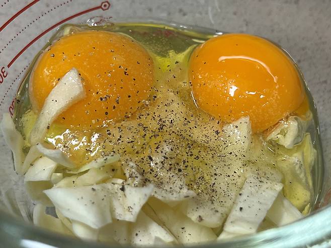 양배추 반줌과 계란 2개를 그릇에 넣습니다. 그리고 후추, 소금을 밑간을 해서 잘 풀어 주세요.