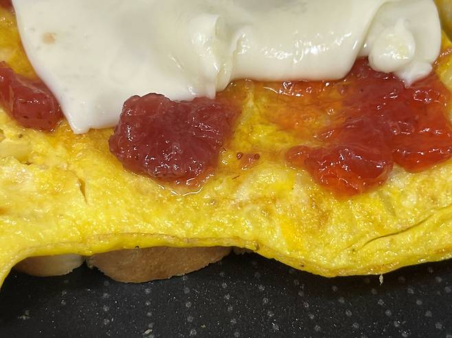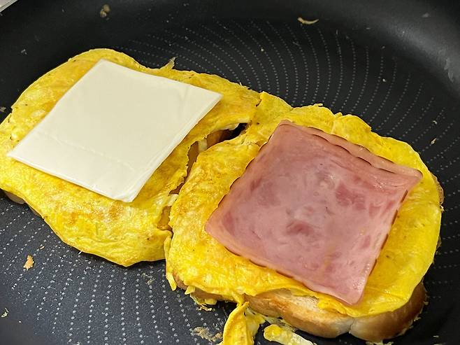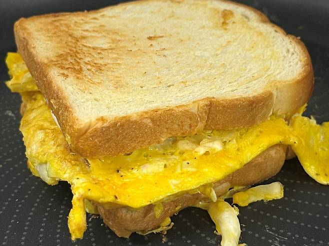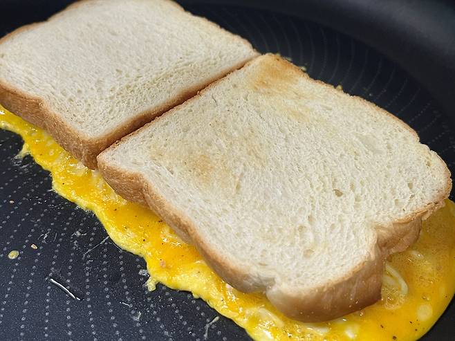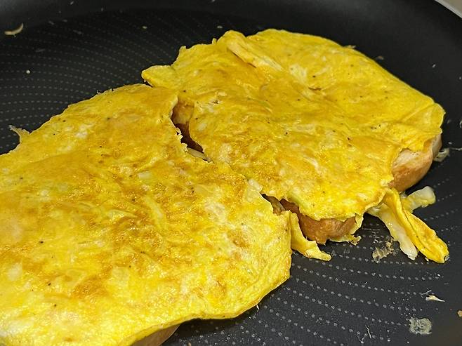 계란이 살짝 덜 익은 상태면 식빵과 계란 접착력이 좋아집니다. 이 상태에서 뒤집으면 이런 모양으로 됩니다. 식빵 양쪽에 계란 지단이 깔리게 되는 것이지요.