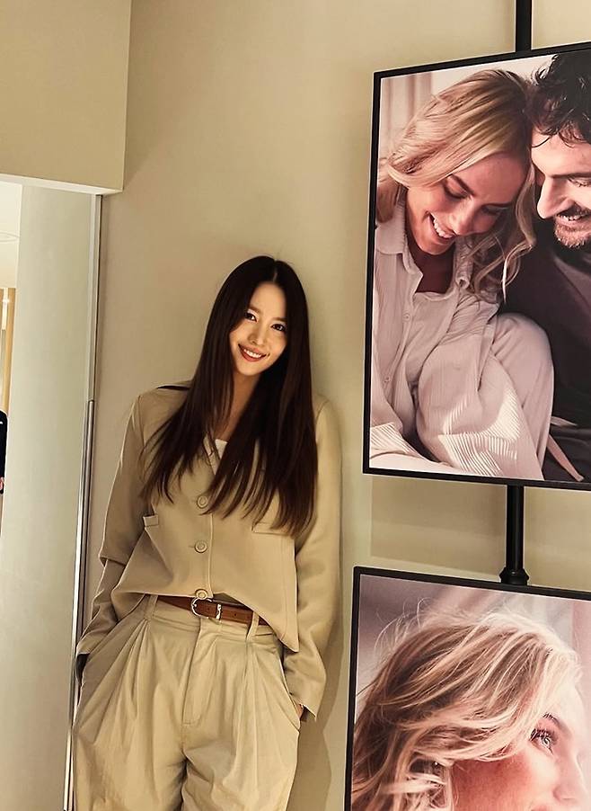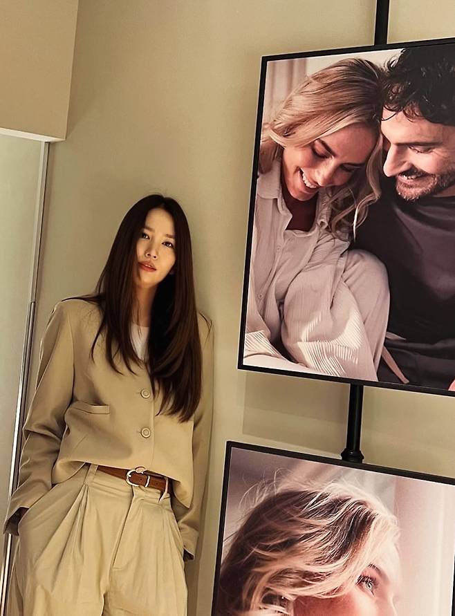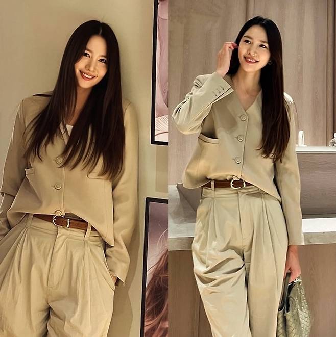 공개한 사진에서 진아름은 원턱 하이웨이스트 베이지 팬츠에 브이넥 재킷 셋업 나들이룩으로 우월한 기럭지의 모델 핏을 과시했다.