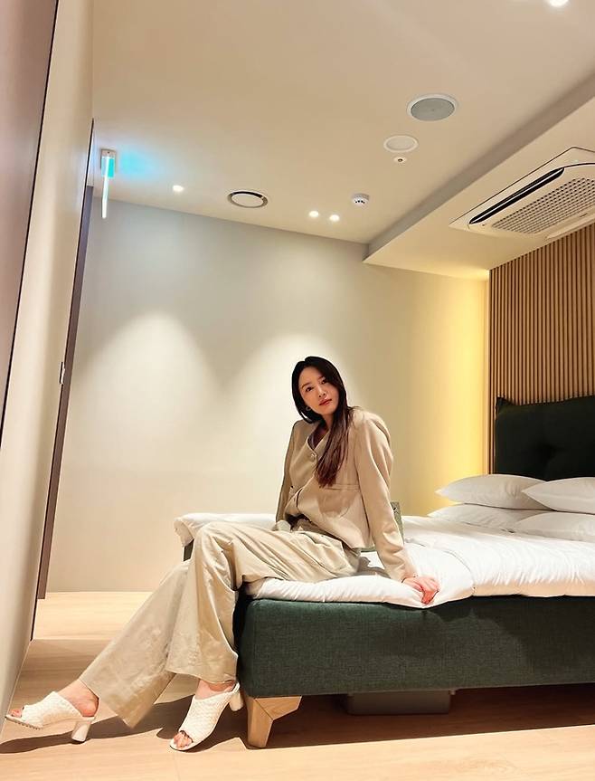 모델 진아름이 하이웨이스트 팬츠와 브이넥 재킷 셋업 나들이룩으로 늘씬한 기럭지를 뽐냈다.