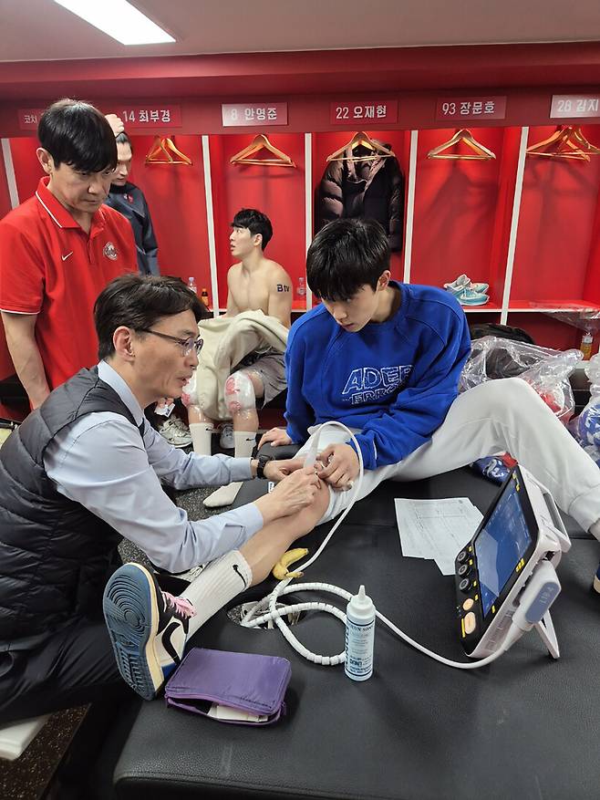 김진수 원장은 준비해 온 초음파 치료기를 꺼내 선수들의 부상 부위를 살폈다.