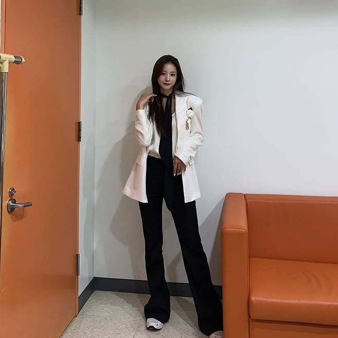 솔지의 이번 착장은 깔끔한 화이트 톤 재킷과 슬리브리스 이너, 블랙 슬랙스를 매치해 모던하고 시크한 감각을 연출했다. 여기에 길게 늘어진 블랙 스카프를 넥 리본처럼 연출해 페미닌한 무드를 강조했고, 재킷의 왼쪽 가슴에 장식된 로즈 코사지와 골드 참 디테일은 룩 전체에 고급스러운 입체감을 더했다.