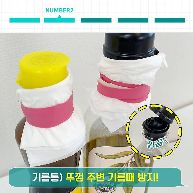 병 입구에 키친타올 혹은 휴지를 덧댄 후 고무장갑으로 고정시켜주세요. 이렇게만 해줘도 기름이 바로 흡수돼 기름통을 깨끗하게 사용할 수 있답니다~