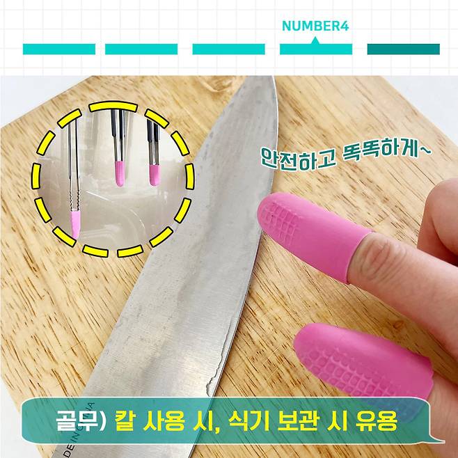 칼질할 때 도마가 밀리며 위험천만했던 상황 있으시죠? 도마가 밀리면 위험할 뿐만 아니라 재료도 반듯하게 썰어지지 않잖아요~ 그럴 때 양 끝에 잘린 고무장갑을 껴주세요. 고무의 마찰력으로 인해 도마가 밀리지 않아요!
