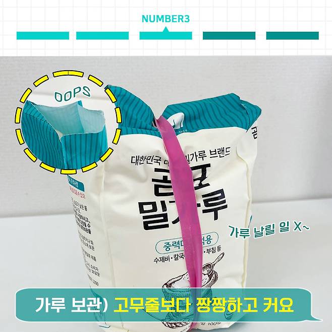 밀가루나 튀김가루 등등 한 번에 다 쓸 수 없는 재료들이 있죠. 이런 재료들은 소분해놓고 나머지는 보관해야하잖아요. 그런데 클립도 불안하고, 고무줄은 너무 작죠?
