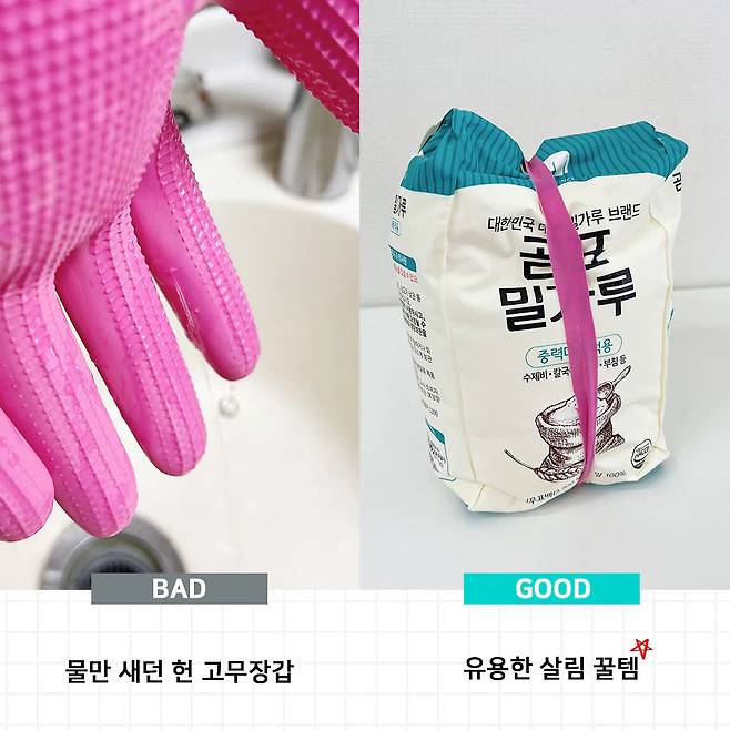 고무 장갑으로 해결 끝! 먼저 봉다리를 돌돌 말아 밀봉한 후 자른 고무장갑을 세로로 끼워주세요. 아무래도 밀가루는 부피가 있으므로 고무장갑 몸통 부분을 가져오면 좋다는!