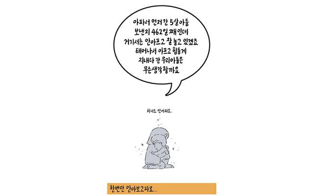 제대로 이름을 알리기 시작한 건2018년부터 연재한 인스타툰(인스타그램에 올리는 만화) ‘키크니의 무엇이든 그려드립니닷!’을 통해서입니다. 짧게는 한 컷, 길어도 열 컷을 넘지 않는 그의 그림 속엔 상황을 180도 비트는 풍자와 유머, 어느새 눈물 쏙 빼놓는 감동과 위로가 교차합니다. ‘술병 나서 이틀째 설거지 안 하고 있는데 그릇들은 무슨 생각하는지 그려달라’는 요청에 ‘언제까지 그릇게 살래’라며 한숨을 내쉬는 설거지더미가 등장하고 ‘비속어 많이 쓰는 윗사람 입 다문 모습을 그려달라’는 호소에 ‘음속어’로 이야기하는 상사를 묘사해 소심한 복수도 대행해줍니다. 어린아이와 엄마가 서로를 꼭 안고 있는 그림엔 ‘하나도 안 아파요, 한 번만 안아보고파요’라는 말이 말줄임표와 함께 따라붙습니다. 아파서 먼저 떠난 다섯 살 아들이 무슨 생각을 하고 있을지 그려달라는 사연을 작가의 상상으로 풀어낸 것입니다.