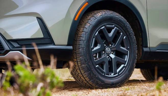 혼다는 이미 험로 주행에 최적화된 4세대 패스포트 트레일스포츠를 선보인 바 있습니다. 패스포트 트레일스포츠는 독특한 외관 디자인과 함께 개선된 서스펜션, 하부 스키드 플레이트, 눈에 띄는 전방 견인 고리, 그리고 굵은 트레드의 올터레인 타이어를 장착했습니다. CR-V 트레일스포츠는 이러한 하드웨어적인 요소는 갖추지 못했지만, 휠과 타이어에서 주목할 만한 업그레이드가 이루어졌습니다. 콘티넨탈 크로스콘택트 ATR(Continental CrossContact ATR) 올 터레인 타이어를 장착하여, 패스포트 트레일스포츠만큼 강력한 접지력을 제공하지는 않지만 일반 CR-V의 올시즌 타이어보다 향상된 험로 주행 성능을 자랑합니다.
