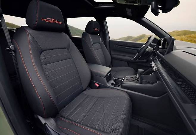 트레일스포츠는 CR-V 스포츠 트림을 기반으로 제작되었으며, 직물 시트가 적용되었습니다. 혼다는 트레일스포츠가 직물 시트와 파워 테일게이트를 모두 갖춘 최초의 CR-V라고 밝혔습니다. 앞좌석 헤드레스트에는 트레일스포츠 로고가 자수되어 있으며, 기본 사양으로 제공되는 전천후 플로어 매트에도 동일한 로고가 적용되었습니다. CR-V는 패스포트 트레일스포츠와 같은 주황색 주간 주행등은 없지만, 실내에는 주황색 앰비언트 라이팅이 적용되어 있습니다. 트레일스포츠에는 또한 새로운 10.2인치 디지털 계기판, 열선 앞좌석 시트, 열선 스티어링 휠 및 선루프가 기본으로 탑재됩니다. CR-V 스포츠 트림에는 240와트 6 스피커 사운드 시스템이 장착되지만, 트레일스포츠는 320와트 8 스피커 사운드 시스템이 탑재되어 더욱 풍부한 사운드를 즐길 수 있습니다.