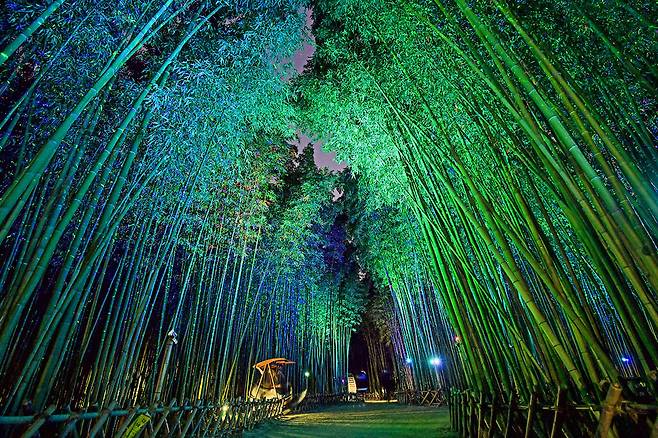 대나무숲은 밤이 되면 조명이 나무를 비추어 신비로운 분위기를 자아냅니다.
