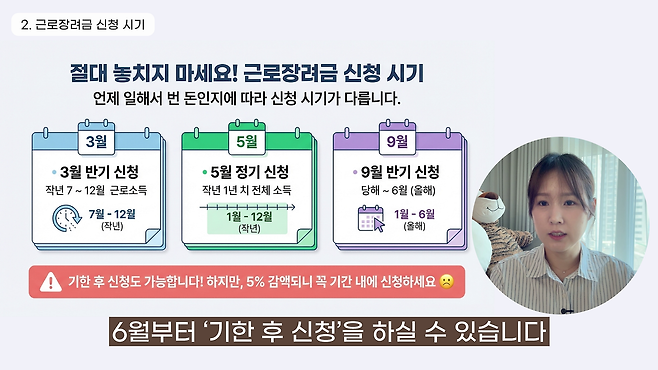 작년 9월에 이미 상반기분 장려금을 신청했다면 이번에는 따로 신청하지 않아도 됩니다. 5월 정기 신청 기간을 놓치면 6월부터 ‘기한 후 신청’을 할 수 있으나, 이때는 기한 내 신청하면 받는 금액의 95%만 받게 됩니다.