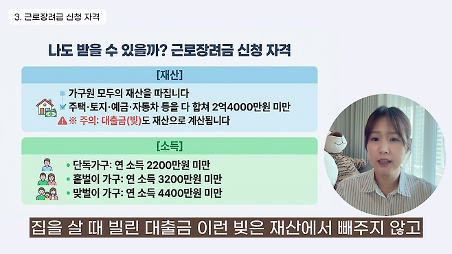 근로장려금을 받으려면 가구원 모두의 재산 합계액이 2억4000만원 미만이어야 합니다. 주택, 토지, 예금, 자동차 등이 포함되며 집을 살 때 빌린 대출금 등 ‘빚’은 재산에서 차감하지 않으니 주의해야 합니다.