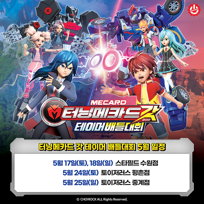 대회 기간 주말마다 펼쳐지는 이번 이벤트는 2021년 국내 애니메이션 시리즈 완구 판매 최고 기록을 공인받은 베스트셀러 '터닝메카드'의 새 시리즈 '터닝메카드 갓'을 기다려온 팬들에게는 오랫동안 기다려온 순간이 될 예정이다. 대회 일정은 5월에 스타필드 수원점(17~18일), 토이저러스 평촌점(24일), 토이저러스 중계점(25일) 등으로 확정됐으며, 이후의 스케줄은 추후 공지된다.