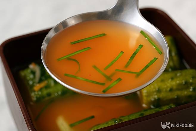 김치 국물은 배를 통째로 갈아 만든 배즙과 다시마 우린 물을 섞어 사용한다. 배즙은 단맛과 향을 살려주고, 다시마물은 밑맛을 잡아준다. 여기에 고춧가루를 약간 더하면 연한 색의 국물이 완성된다. 맵지 않고 시원한 맛이 주가 되는 김치다.