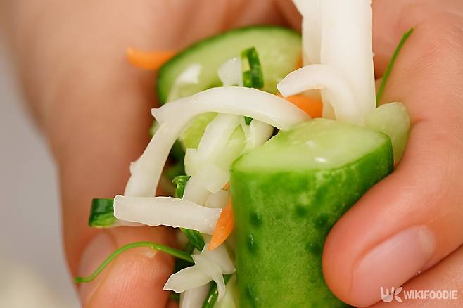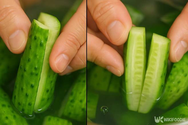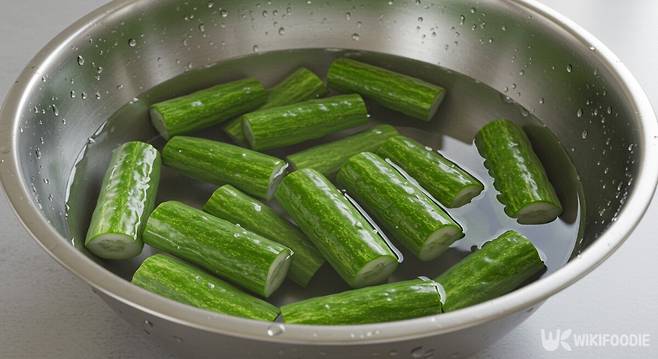 오이를 꺼낸 뒤, 절였던 물을 끓여 오이를 한 번 담갔다 바로 꺼낸다. 이 과정을 거치면 오이가 쉽게 무르지 않고 아삭한 식감을 오래 유지한다. 뜨거운 물은 반드시 절인 물을 사용하는 것이 좋다.