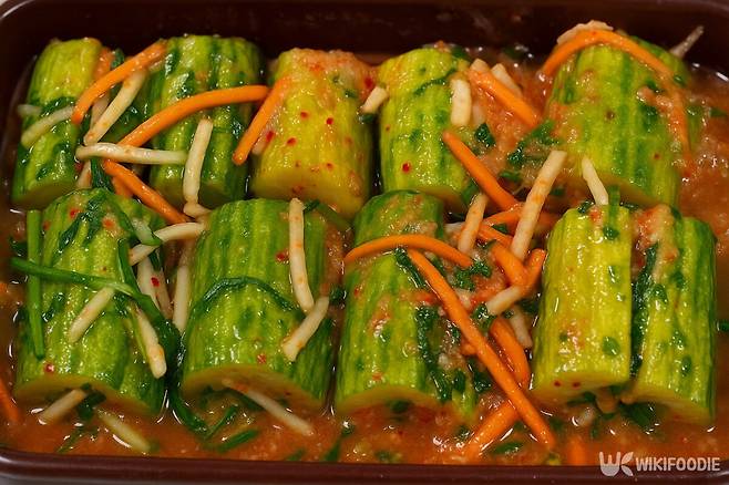 오이에 칼집을 깊게 넣어야 속재료가 잘 들어간다. 절인 후 뜨거운 물에 한 번 담가야 오이가 덜 무른다. 물기를 충분히 빼야 김치 국물이 탁해지지 않는다.
