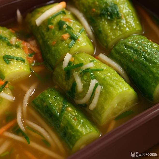 오이소박이 물김치 한 통에는 수분이 많은 채소와 자연 발효된 채소 국물이 함께 들어가 있어 여름철 반찬으로도 제격이다. 김치 국물에 들어간 배 또한 옛 문헌에 자주 등장하는 과일로, 즙으로 갈아 국물에 넣으면 단맛과 향을 동시에 낼 수 있다. 생배를 그대로 사용하는 방식은 시판 김치와 차별화되는 점이다.