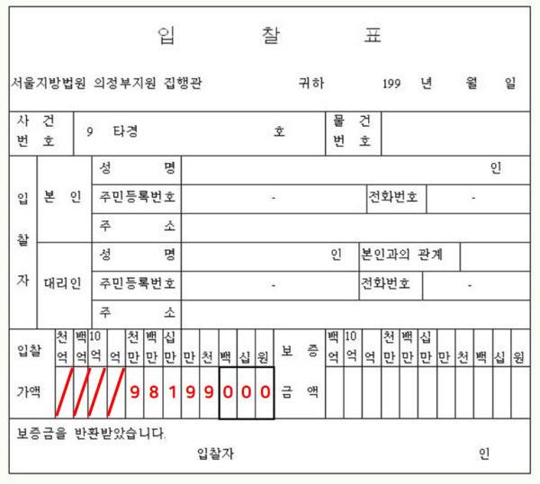 법원 입찰표를 보면 낙찰가를 적어내는 칸이 일의 자리숫자부터 천억자리 숫자까지 단위별로 각각 나눠져있다. 낙찰자는 금액 단위를 오기재하는 일을 막기 위해 천억·백억·십억단위에 ‘/’표시를 써서 공란을 막은 뒤, 최저매각가보다 소폭 높은 9819만9000원을 써냈다. 그런데 법원이 ‘/’ 표시를 숫자 1로 인식하고, 입찰가를 1111억9819만9000원으로 판단해 낙찰자를 선정한 것이다.