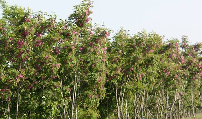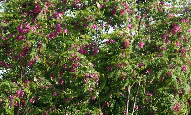 경기 양평 두물머리 – 자연과 물이 어우러진 두물머리 주변에도 꽃아까시나무가 심어져 있습니다. 잔잔한 물결과 어우러진 분홍빛 나무들의 모습은 사진 찍기에 더없이 좋은 배경이 됩니다.