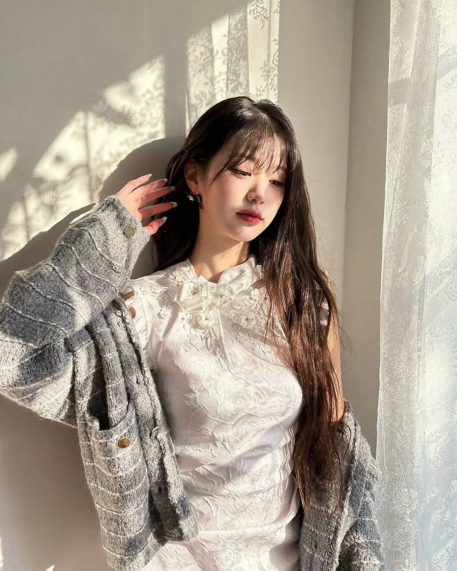 장원영뿐만아니라 화이트 톤의 침대, 이불, 자연광, 뒷배경의 자연 풍경 등이 믹스되어 따뜻하고 환상적인 분위기를