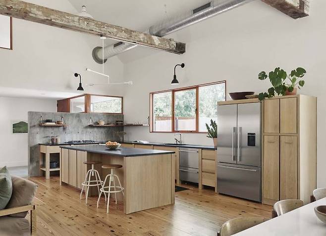 목재를 통해 따뜻한 감성을 두르고, 가벽 소품 등을 통해 인더스트리얼한 느낌을 심었다. 특히 주방 공간이 인더스트리얼함이 강하다. 노출된 목제 프레임과 실내 온도를 조절하는 천장의 환풍기 등이 빈티지한 느낌을 강하게 만들어주고 있다.