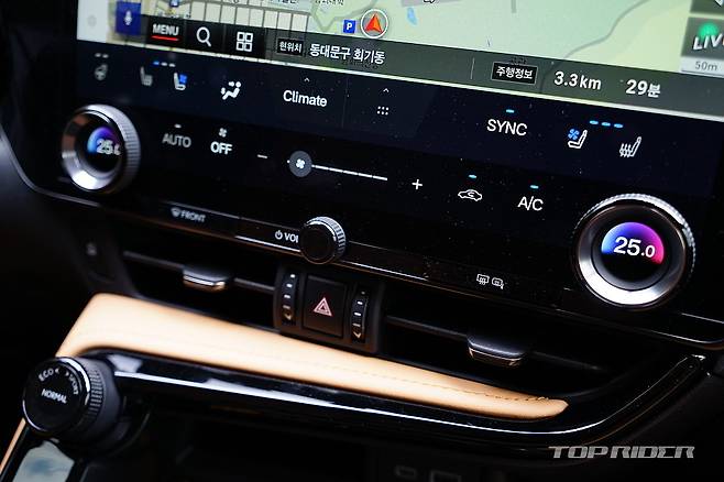 파노라믹 뷰 모니터는 또 다른 눈에 띄는 장비다. 단순히 차량의 360도 상황을 보여주는 것을 넘어서, 차체 하부와 타이어 주변까지 보여주는 '시스루 뷰'는 주차는 물론, 험로 주행에서도 노면 상황을 확인할 수 있다. 코너링 뷰 사용시 운전자의 사각지대는 제로에 가깝다.