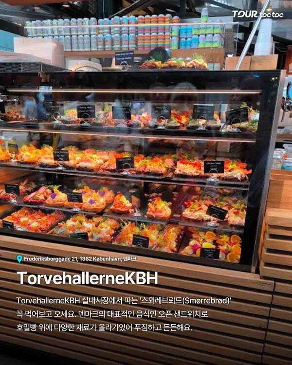 먹거리도 코펜하겐 여행의 즐거움입니다. TorvehallerneKBH 실내 시장에서는 덴마크 전통 오픈 샌드위치 스뫼레브뢰드를 맛볼 수 있습니다. 다양한 재료가 듬뿍 올라간 샌드위치는 여행자들의 후기에 꼭 등장합니다. 코펜하겐 가볼만한곳으로 언제나 추천되는 이유가 있죠.
