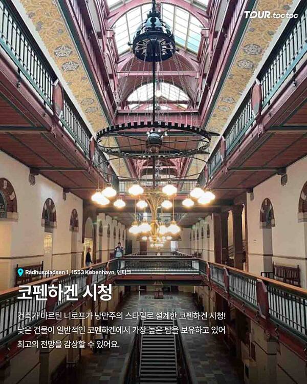 코펜하겐 시청은 건축의 아름다움을 느낄 수 있는 명소입니다. 웅장한 내부와 높은 탑 전망대는 시내 전경을 감상하기에 최고의 장소입니다. 짧은 일정으로 코펜하겐 여행을 떠나는 사람들에게 효율적인 코스가 됩니다. 코펜하겐 여행코스 중에서도 랜드마크로 꼽히는 곳이죠.