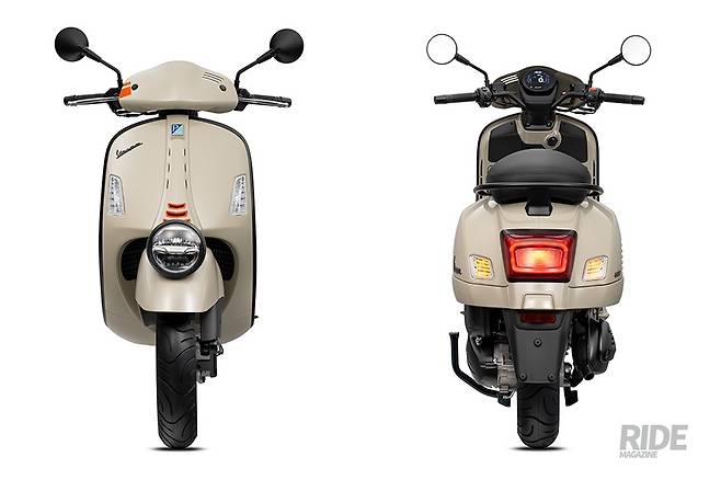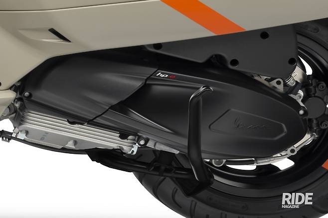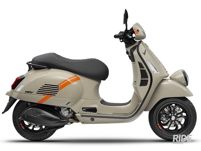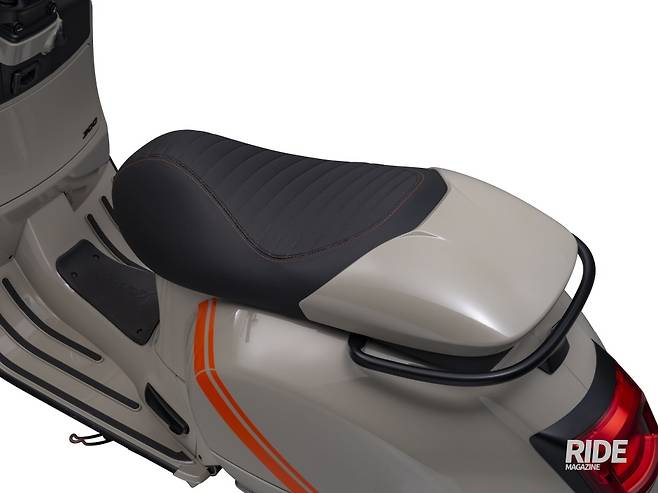 GTV의 디자인은 베스파 본연의 클래식한 아이덴티티를 계승하면서 레이싱 룩을 접목해, ‘스포티한 클래식’을 추구했다. 상징적인 베스파 전면의 머드 가드와 프론트 펜더에 장착된 헤드 램프, 리어 램프를 둘러싸고 있는 프레임, 차제 주변을 휘감는 라인과 탠덤 그립 핸들, 풋 페그, 머플러 커버, 미러, 계기반에 ‘맷 블랙’으로 포인트를 넣었고, GTV의 특징 중 하나인 ‘레이싱 룩을 적용한 1인승 시트’와 후면 페어링의 도장, 핸들 바 중앙 전면에 위치한 커버는 좀 더 레트로한 감각을 완성시켰다. 다른 브랜드의 라이더들에게는 생소할 수 있겠지만, 베스파의 프론트 실드 중앙은 베스피언들에게 ‘넥타이’라고 통용되는데, 이번 GTV의 넥타이는 하단으로 내려갈수록 폭이 넓어지는 ‘날렵한’ 구조로 적용됐다. 베스파 특유의 프런트 싱글 스윙암에 연결된 블랙 휠림에는 주황색 포인트가 눈길을 끈다.
