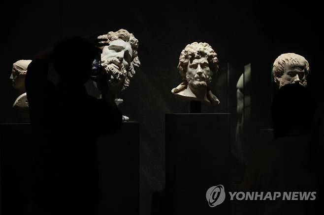 (서울=연합뉴스) 진연수 기자 = 14일 서울 용산구 국립중앙박물관 상설전시관에 신설된 고대 그리스·로마실에서 열린 '그리스가 로마에게, 로마가 그리스에게' 전시 언론공개회에서 참석자들이 전시장을 둘러보고 있다. 이번 전시는 오스트리아 빈미술사박물관과 공동 기획으로 가이우스 율리우스 카이사르의 초상 등 126점을 선보인다. 2023.6.14