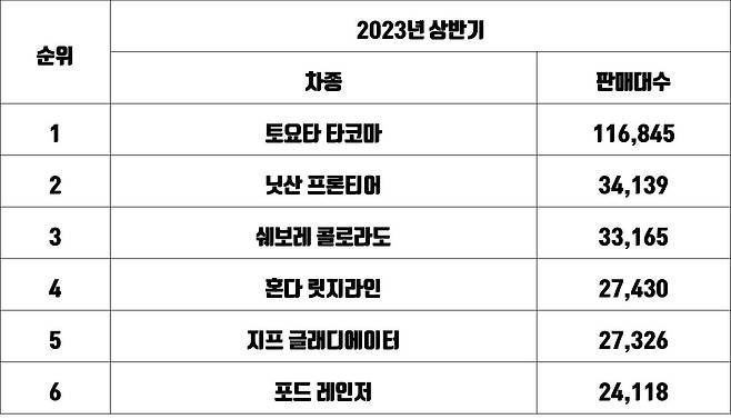 국내 시장에서도 판매 중인 쉐보레 콜로라도와 지프 글래디에이터는 각각 3만3,000대, 2만7,000대를 기록했다. 포드 레인저는 약 2만4,000대.