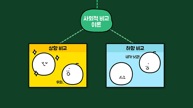 다음으로 사회적 비교 이론은 본인의 태도와 능력, 특성 등을 타인과 비교해 자신을 평가하는 것을 뜻합니다. 사람은 타인을 자신과 비교하면서 동일시하거나 대조하는데, 자기보다 우월한 사람과 비교하는 상향 비교와 열등한 사람과 비교하는 하향 비교로 구분할 수 있고, 이를 통해 동력을 얻거나 열등감을 느낍니다.